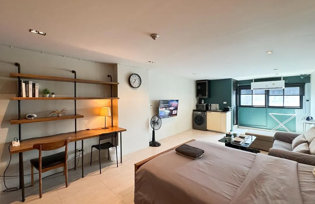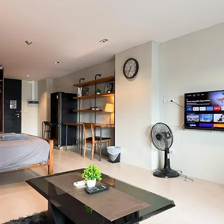 Central 1Br 50Sqm Walk To Bts & Night Market 曼谷距离I'm Park社区购物中心仅1.8千米。 客人会在露台休息。